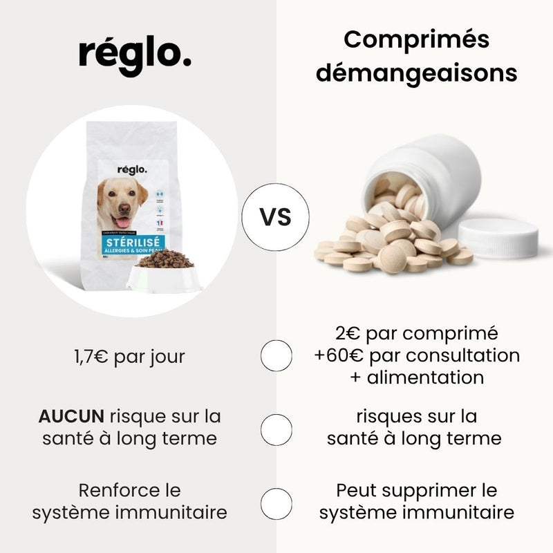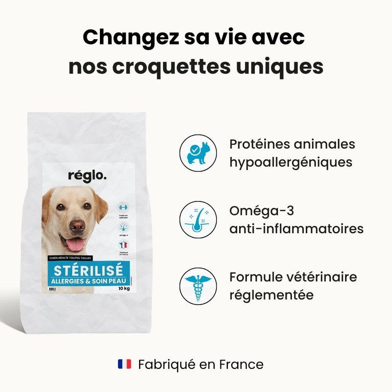 Les croquettes Réglo sont formulées par des vétérinaires avec une restriction stricte des ingrédients allergènes communs présents dans les croquettes classiques. Elles sont fabriquées avec des protéines animales rares et sans céréales dans le sud-ouest de la France.