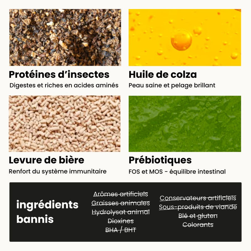 Les insectes de nos croquettes sont élevés par nos éleveurs partenaires dans des conditions semblables à celles de leur milieu naturel : ils vivent naturellement en forte concentration - contrairement aux poissons, aux volailles ou aux bovins des élevages intensifs. Ils grandissent naturellement pour atteindre maturité en 14 jours, cela sans antibiotiques - à l'inverse des élevages de poulets biologiques par exemple.