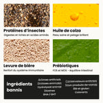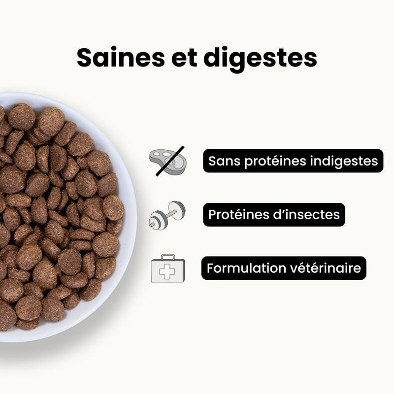 Pour éviter les troubles digestifs, ces croquettes ne contiennent pas de céréales ni de sous-produits de bœuf, poulet, agneau ou saumon. Elles les remplacent par des protéines animales de haute qualité : des protéines d’insectes.