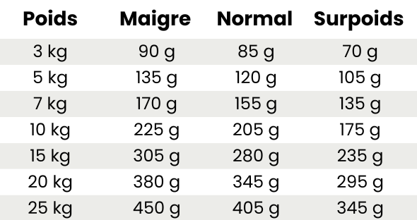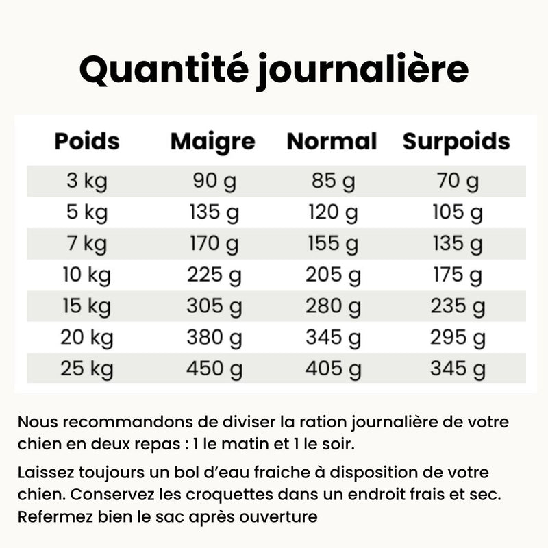 Nous recommandons de diviser la ration journalière de votre chien en deux repas : 1 le matin et 1 le soir.