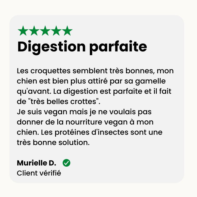 Les protéines d'insectes sont des protéines animales de haute qualité. Incomparables avec les déchets de viande utilisés dans les autres croquettes.