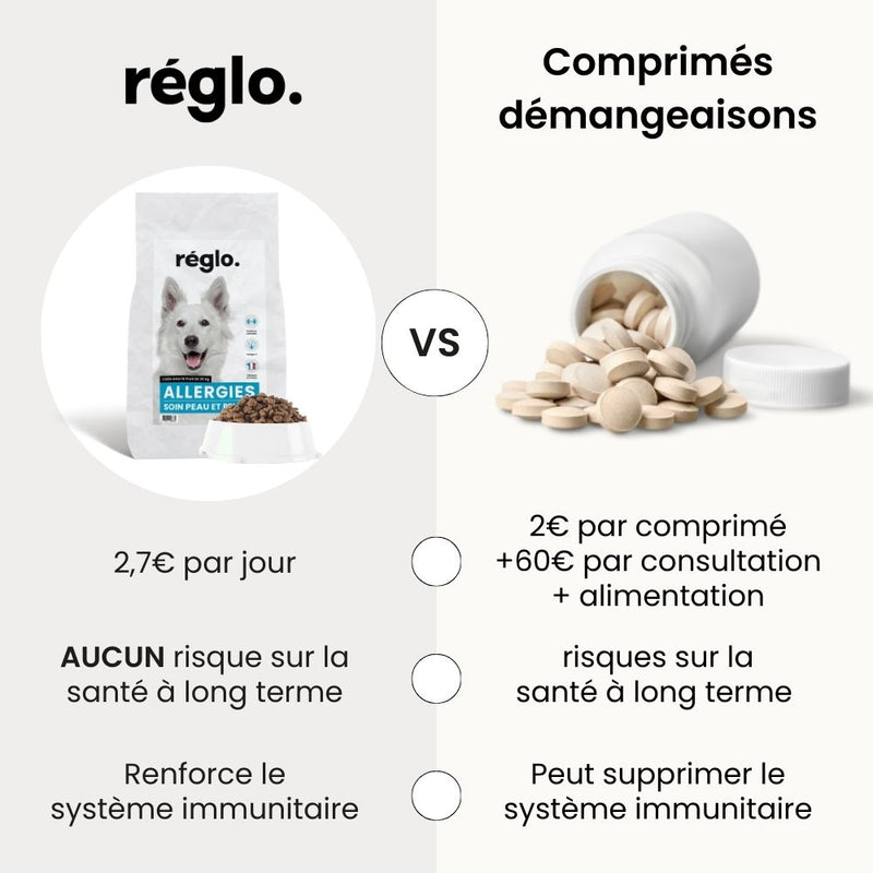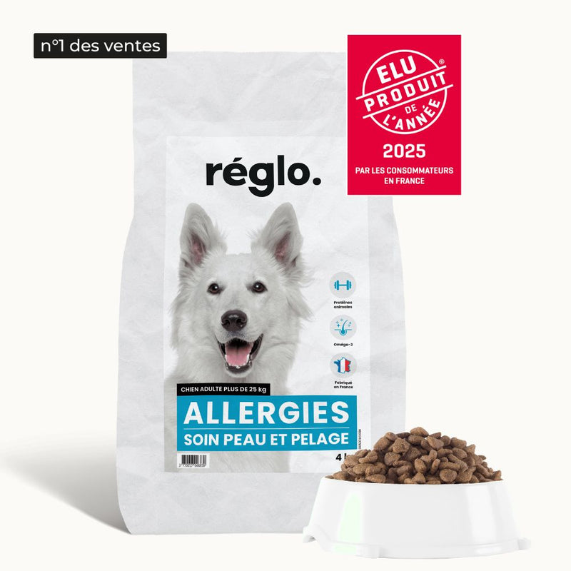 Dans une étude interne auprès de clients Réglo, 94% des propriétaires de chiens ayant répondu trouvent les croquettes efficaces contre les allergies alimentaires.
