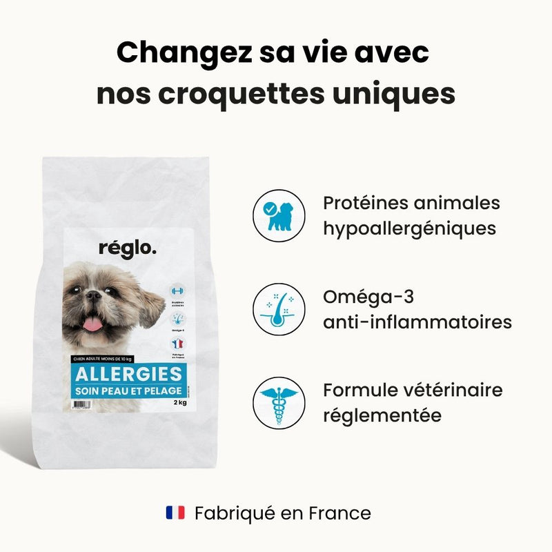 Dès que la santé de la peau d’un chien s’améliore après avoir commencé les croquettes Réglo, cela confirme le diagnostic d’allergies alimentaires. Les croquettes étant saines et riches en protéines animales, elles sont une alimentation adaptée au bien-être du chien toute sa vie. Consultez votre vétérinaire pour être guidé sur des besoins spécifiques de votre chien.