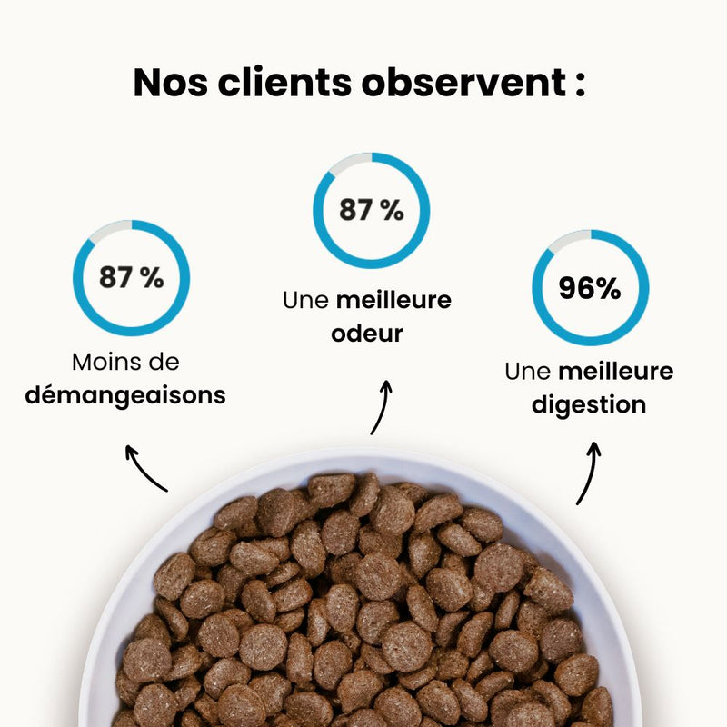 Dans une étude interne auprès de clients Réglo, 94% des propriétaires de chiens ayant répondu trouvent les croquettes efficaces contre les allergies alimentaires.