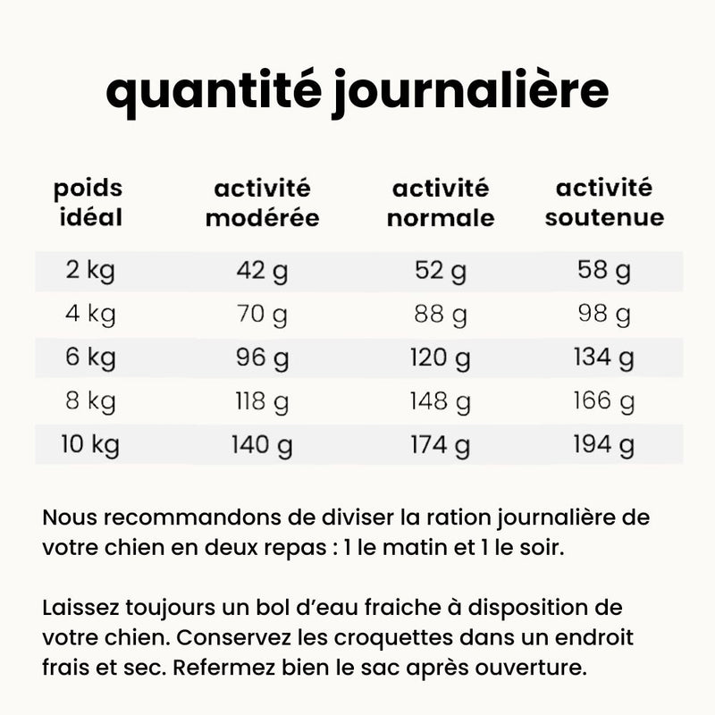 Nous recommandons de diviser la ration journalière de votre chien en deux repas : 1 le matin et 1 le soir.