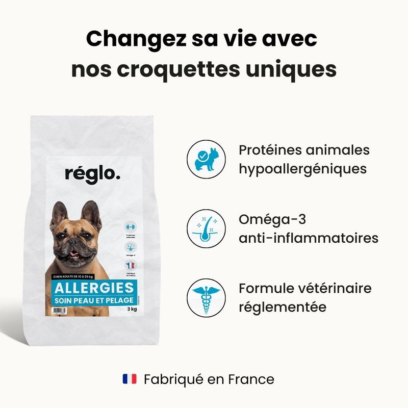Les croquettes Réglo sont formulées par des vétérinaires avec une restriction stricte des ingrédients allergènes communs présents dans les croquettes classiques. Elles sont fabriquées avec des protéines animales rares et sans céréales dans le sud-ouest de la France.