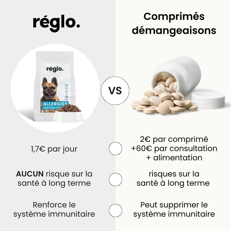 Dans une étude interne auprès de clients Réglo, 94% des propriétaires de chiens ayant répondu trouvent les croquettes efficaces contre les allergies alimentaires.