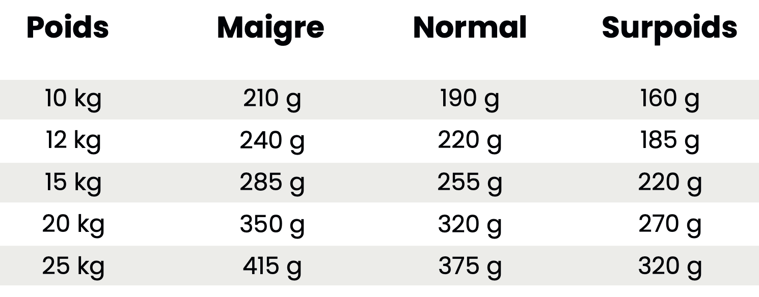 Nous recommandons de diviser la ration journalière de votre chien en deux repas : 1 le matin et 1 le soir.