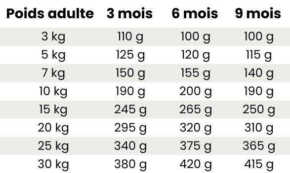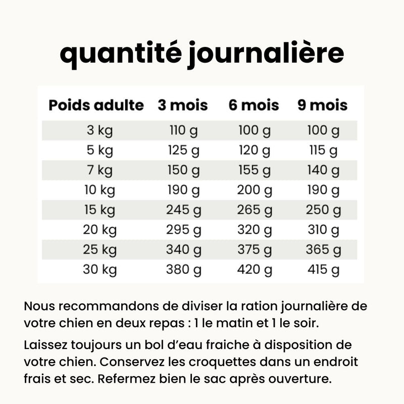 Nous recommandons de diviser la ration journalière de votre chien en deux repas : 1 le matin et 1 le soir.
