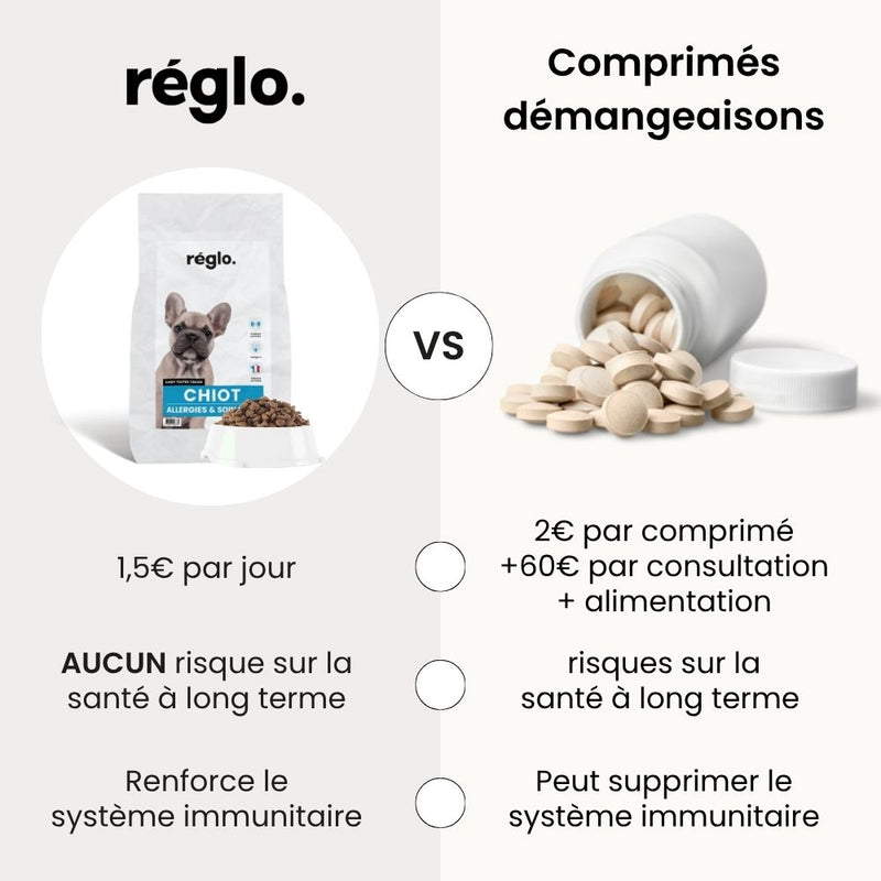 Pour obtenir des résultats et soulager les symptômes d’allergies alimentaires, il est essentiel de nourrir votre chiot exclusivement avec les croquettes Réglo. Donner d’autres aliments (friandises, restes de table, autres croquettes ou pâtées) peut réintroduire des allergènes et empêcher toute amélioration. Si vous souhaitez ajouter des extras, choisissez uniquement des produits strictement hypoallergéniques.