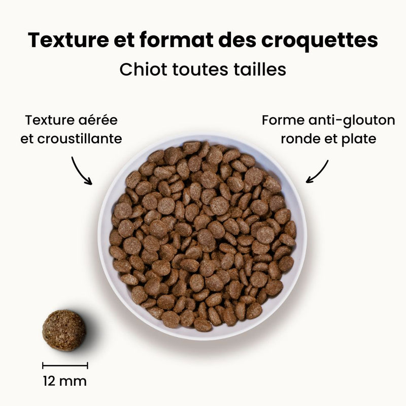 Nos croquettes peuvent être données à votre chiot dès le sevrage, et jusqu’à la fin de sa croissance. Elles sont formulées pour couvrir tous les besoins nutritionnels spécifiques à cette période : développement du cerveau, des os, du système immunitaire et digestif.