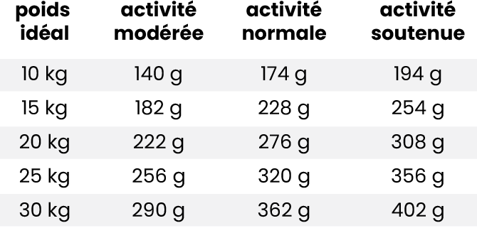 Nous recommandons de diviser la ration journalière de votre chien en deux repas : 1 le matin et 1 le soir.